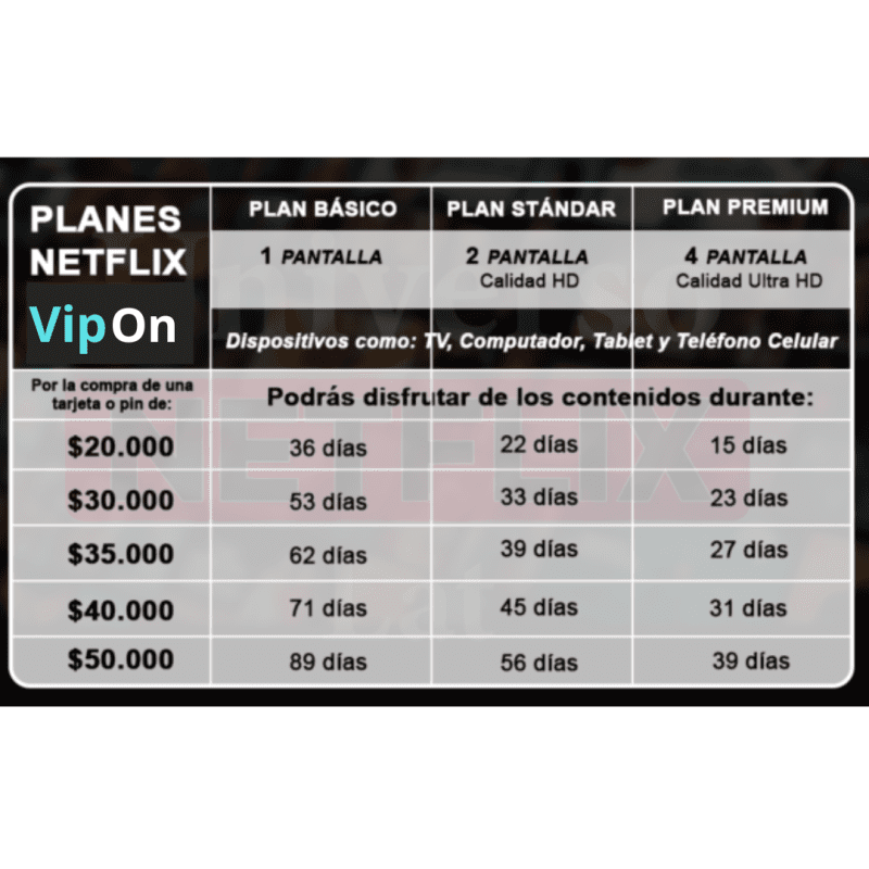 Con la compra del pin en prepago Netflix, la forma de ver películas, series y documentales es posible en Streaming, NETFLIX es uno de los principales proveedores de este servicio, con una cuenta Colombiana disfrutas de películas y programas en internet, en tu Smart TV, consola de videojuegos, PC, Mac, dispositivo móvil, tablet, adicionalmente puedes descargarlos y usarlos offline (sin internet y sin gastar tus datos de navegación, mientras te conectas nuevamente a un Wifi)